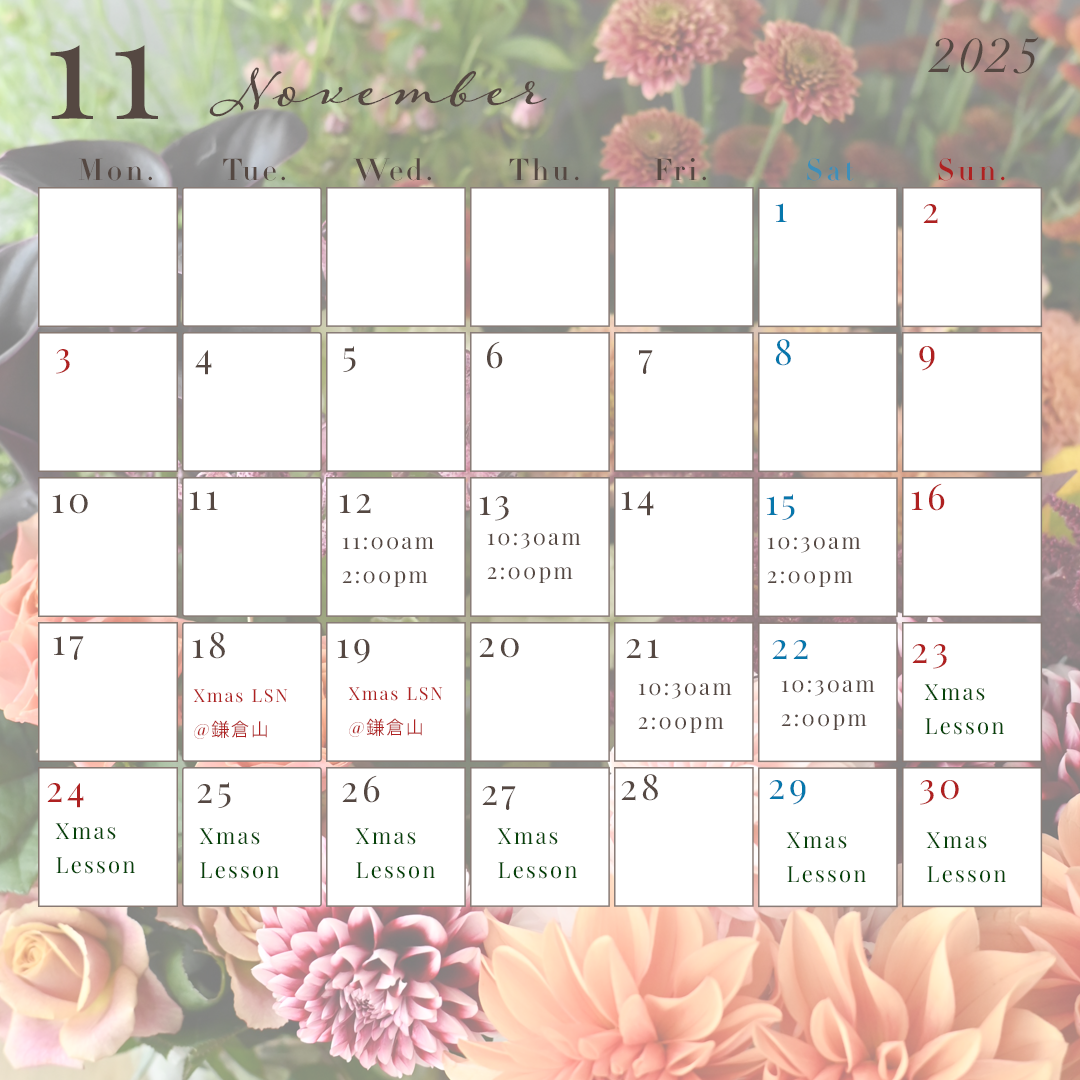 そのほかに年末のお正月飾り、お正月花のレッスンを予定しております。決まり次第こちらにアップいたします。