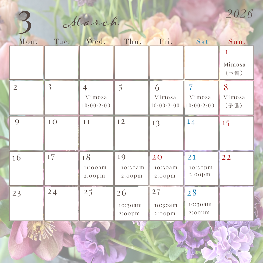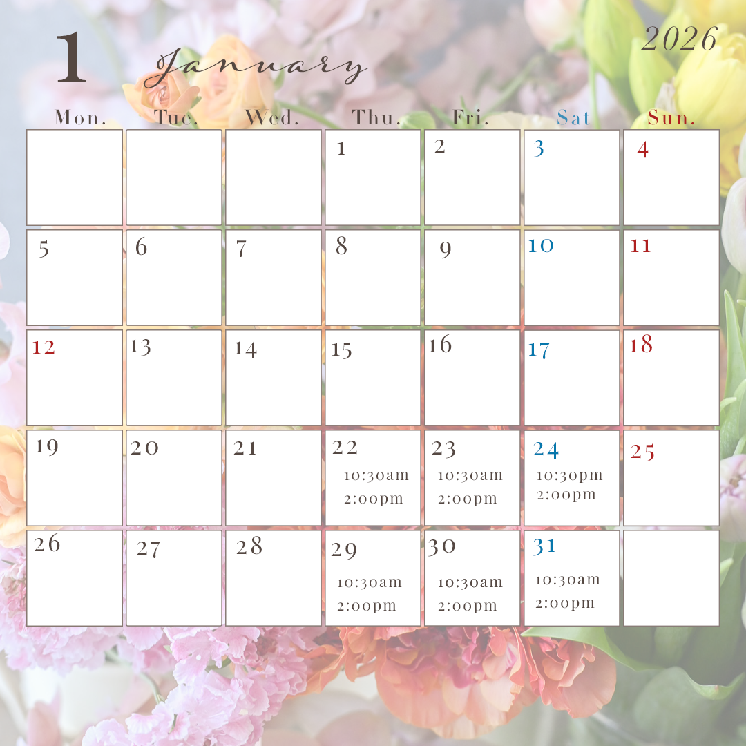 *水曜日と金曜日の午前レッスンは仕入れスケージュールにより11時スタートになる場合がございます。