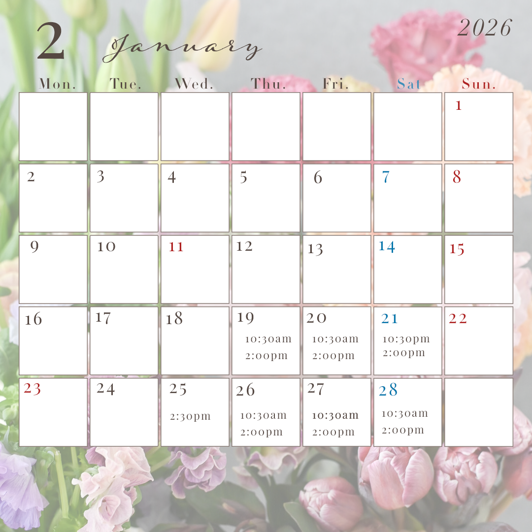 *水曜日と金曜日の午前レッスンは仕入れスケージュールにより11時スタートになる場合がございます。